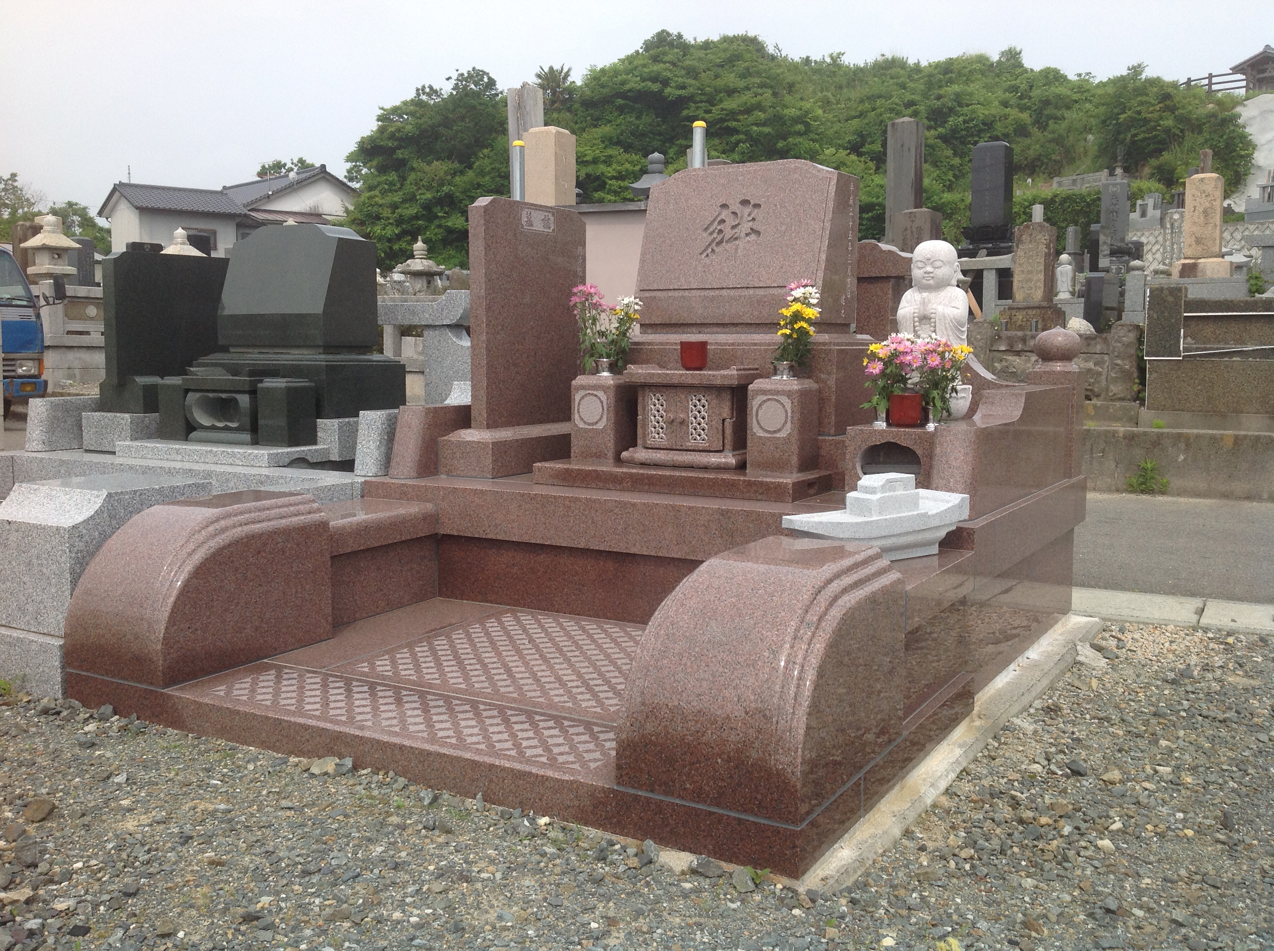 福島県いわき市四倉町にインド産赤系御影石を使用した洋型石碑と外柵を建立させていただきました。