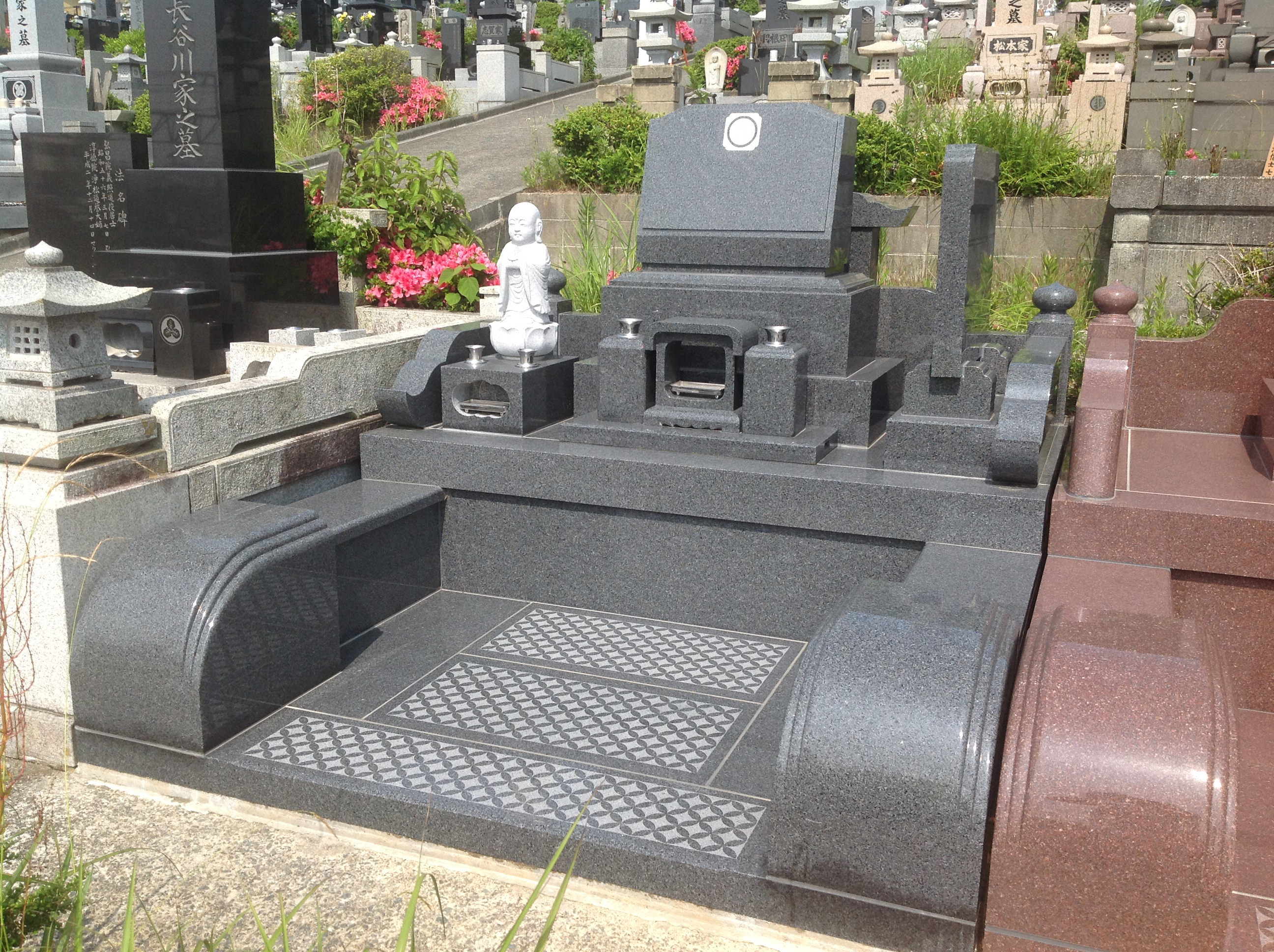 福島県いわき市四倉町に建立致しました。 石碑タイプ 洋型 石碑石種 中国産赤系御影石 外柵石種 中国産赤系御影石 その他の施工例